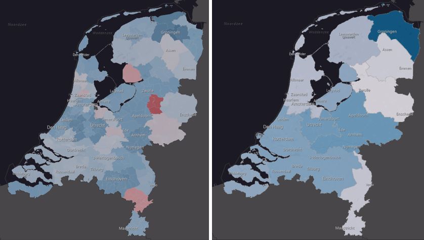 De kaart links laat op gemeenteniveau zien in welke mate de huizenprijzen stegen (rood) of daalden (blauw), de kaart rechts toont hetzelfde op provinciaal niveau. Bekijk de meest recente Maandalert Woningmarkt voor een interactieve, klikbare versie van de kaarten.