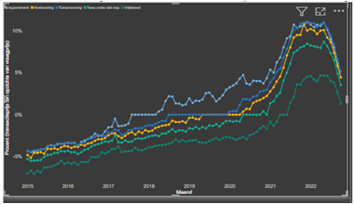 Waar de huizenprijzen in augustus daalden met 0,18% ten opzichte van de maand ervoor, was dit in september al 0,46% en in oktober zelfs 0,64%. De prijsstijgingen op jaarbasis vertonen een vergelijkbare trend. In mei waren de huizenprijzen gemiddeld 17,5% hoger ten opzichte van een jaar eerder, in oktober was hier nog maar 6,4% van over.